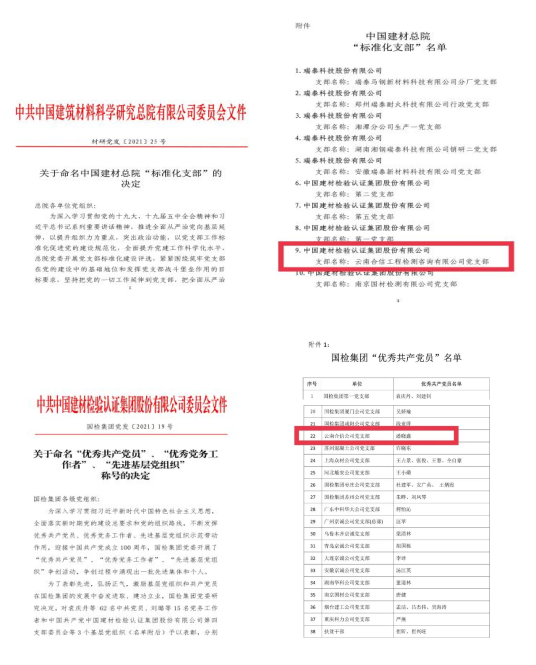 近日,根據(jù)中共中國建筑材料科學(xué)研究總院有限公司委員會(huì)印發(fā) 《關(guān)于命名中國建材總院“標(biāo)準(zhǔn)化支部”的決定》,云南合信工程檢測咨詢有限公司黨支部榮獲中國建材總院 “標(biāo)準(zhǔn)化支部”稱號(hào),支部黨員潘曉鑫獲國檢集團(tuán)“優(yōu)秀共產(chǎn)黨員”榮譽(yù)稱號(hào)。
