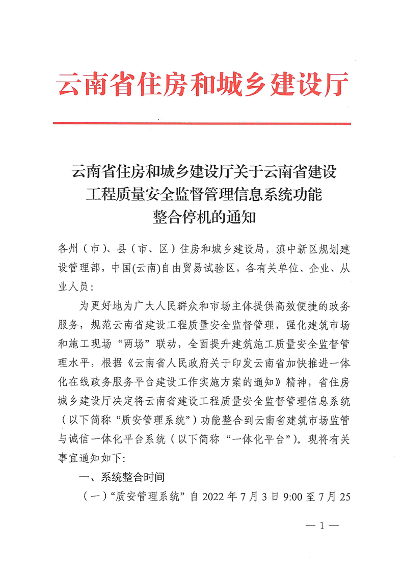 云南省住房和城鄉(xiāng)建設(shè)廳關(guān)于云南省建設(shè)工程質(zhì)量安全監(jiān)督管理信息系統(tǒng)功能整合停機(jī)的通知